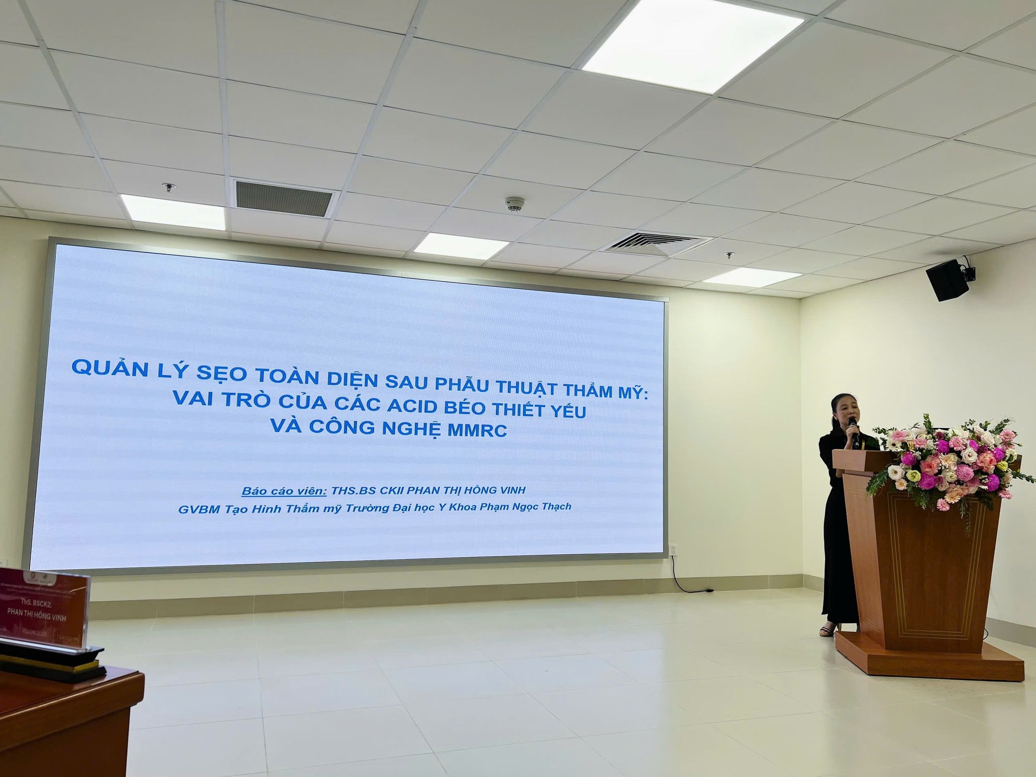 Trong khuôn khổ Hội nghị Khoa học Quốc tế thường niên lần thứ 25 (HSAPS 2025) do Hội Phẫu thuật Thẩm mỹ TP. HCM tổ chức, ThS. BSCKII Phan Thị Hồng Vinh – Giảng viên Bộ môn Phẫu thuật Tạo hình Thẩm mỹ, Trường Đại học Y khoa Phạm Ngọc Thạch – đã trình bày báo cáo với chủ đề: “Quản lý sẹo toàn diện sau phẫu thuật thẩm mỹ: Vai trò của các acid béo thiết yếu (WOUND) và công nghệ MMRC (ALHYDRAN)”.